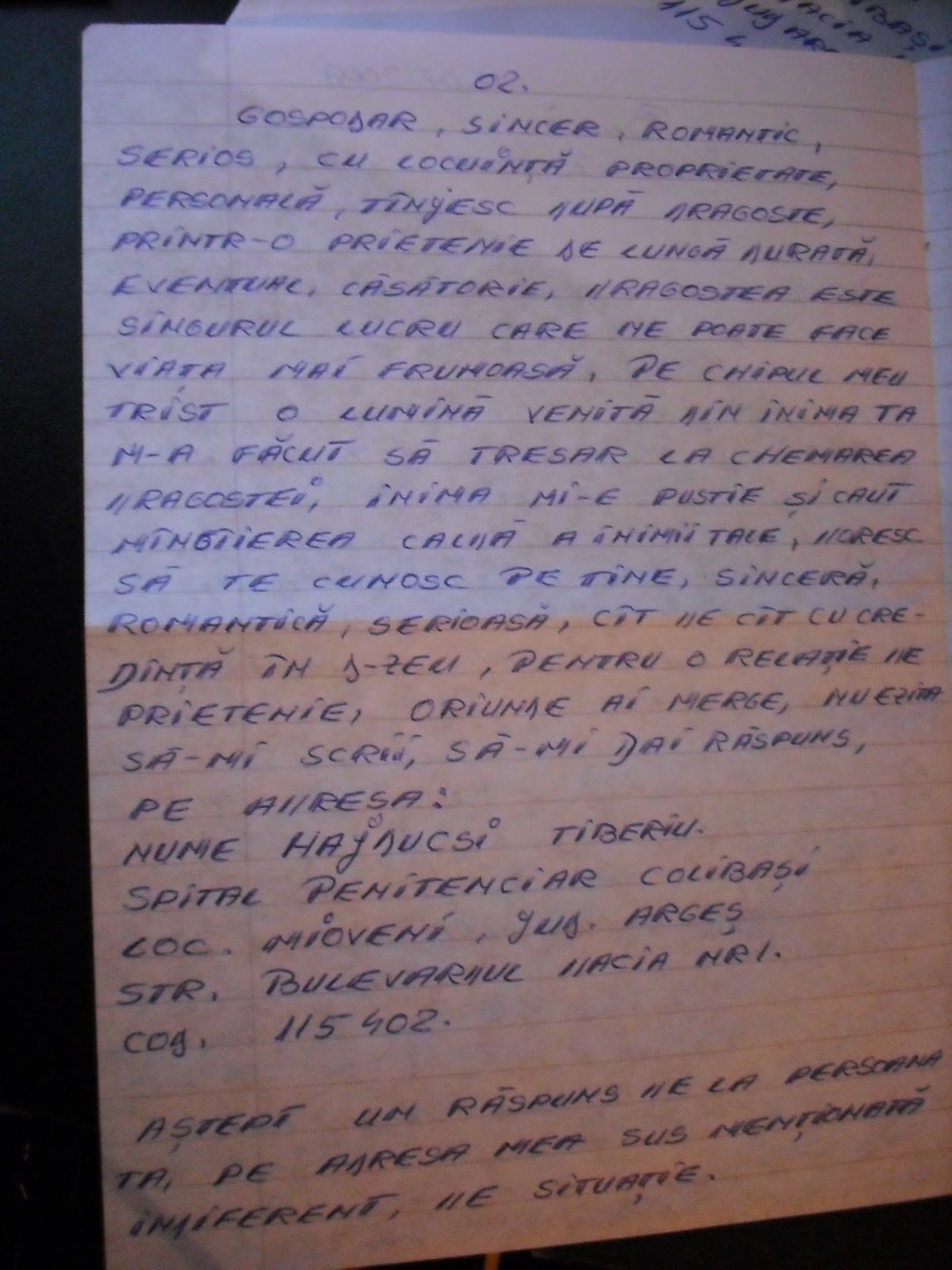 Făceam curat într-un dosar mai vechi când am dat de o scrisoare pe care am primit-o în 2008 de la cineva care, la momentul respectiv, se afla la Penitenciarul Colibaşi, localitatea Mioveni, jud. Argeş. Am păstrat-o. Nu ştiu de ce. Dar ştiu că o voi păstra în continuare.