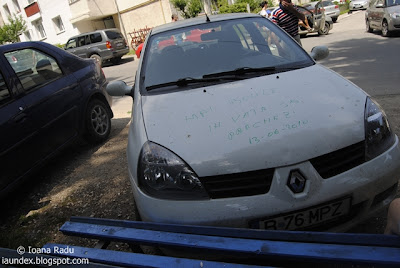 Nu ştiu cine i-a dat carnetul dar când a parcat a ridicat băncuţa de la sol şi nici nu s-a obosit să dea înapoi măcar cîţiva cm. A lăsat-o aşa, a scos cheile şi a plecat. Deranjaţi de incident, doi oameni (care apar în fotografia nr. 3) au intrat în posesia unui marker de la magazinul vis-a-vis de parcare şi… i-au aplicat şoferului un tratament care cred că l-a cam durut când şi-a descoperit capota nu singură ci în compania unui mesaj – “Măi boule, învaţă să parchezi!”